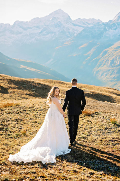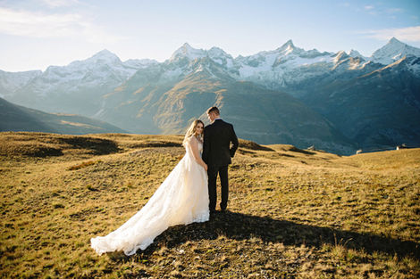 A very intimate Zermatt elopement on a beautiful summer evening, crowned by an incredible sunset. We photographed around Rotenboden and the Riffelberg area, with stunning Matterhorn views that made everything feel very cinematic. The atmosphere was quiet, emotional, and wonderfully simple — just the two of them and the mountains.